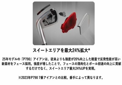25年モデルの『P790』アイアンは、従来よりも強度が20%向上した軽量で反発性能が高い新素材をフェース採用。強度が増したことで、フェースの薄肉化とボール初速の向上に貢献するだけでなく、スイートエリア最大24%UPを実現。