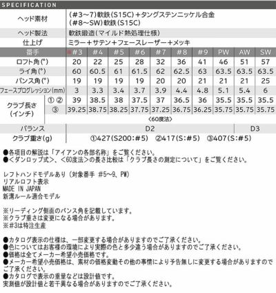 ヘッド素材(#3~7)軟鉄(S15C)+タングステンニッケル合金 (#8~SW)軟鉄(S15C)