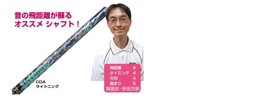 H/S37m/s、年々落ちてきたこの数字。GPSでドライバーの飛距離を測ると200Y強。「昔みたいに230Y飛ばしたい!」それは無理かなと諦めていた私の救世主。それがこのライトニングです。軽量でしなるシャフトはありますが、スライサーの私でも戻せるシャフトは中々ありません。だがこのシャフトは大きくしなって素早く戻るのでスライサーの私でも長尺OK。46インチ仕様でH/S40m/sまで上がり220Yが何回も出ています。