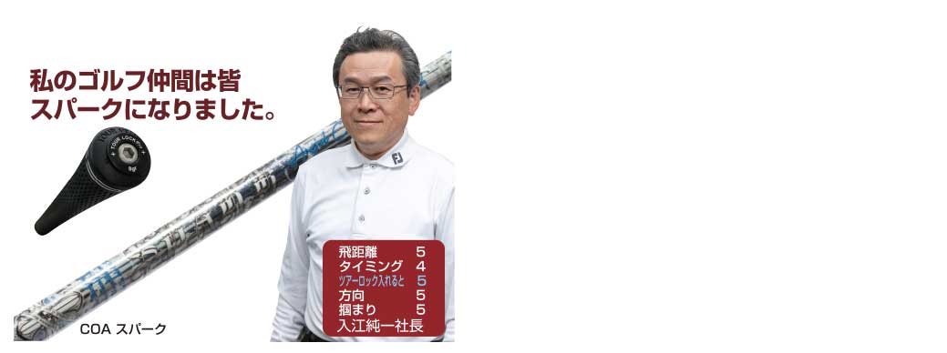 8ページのイーグルの話です。私のような非力な人間にとって、イーグルはホールインワン並の確率なのです。ロングの3打目が通常80〜90Yのコースですが、スパーク40 のドライバー、50Rの3Wがしっかり当たり残りは50Yの第3打がきれいにカップインした時は最高でした!そしてツアーロックとスパークは相性抜群ですから、ぜひ挿入してください。これまでの軽量と違い曲がらないから思い切り打てます!3Wも大きなミスは皆無!フープ層って凄いです。