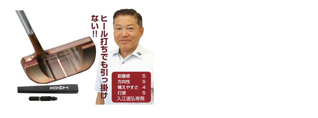 この山田パターはトウヒールバランスが優れているのと、ややヒールよりにシャフトがささっている為、ミスしてヒールに当たっても、ショートしたり引っかけたりしません。又、山田パターは重いヘッドですがツアーロックを入れて自分に合わせて、手元やグリップエンドのウエイトを調整すると、さらにタッチが出しやすくなり、距離感がアップします。是非体感し試して下さい。