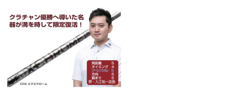 昨年に限定発売し、「とにかく曲がらない!」と早々にメーカー完売。その直後に私の知人をクラチャン2連覇へと導いた初代Xクロームが更なる飛距離性能をプラスして再度100本限定で登場!全長に90t高弾性カーボンを使用しながらも、ピンピン感を感じさせず、更に全長に配置されたフープ層によって振り遅れを防いでくれます。また前作からの進化としてガラスコーティングを施す事で、より分厚いインパクトを実現!H/Sも更に上がるかも!?
