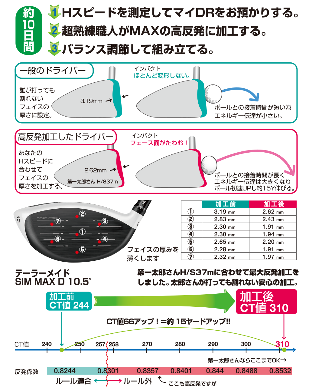 ルールギリギリのキャッチコピーで評価の高かったTUNEの初期モデルが数量限定で復活!たわみエリアを拡大させる為クラウン部分を極薄にしてエネルギーが逃げないWクラウン設計で飛ぶこのヘッドですがH/Sに合わせてフェース面を更に薄くすればとんでもなく飛ぶ事を第一ゴルフは見つけました。出来る限りの長尺私用で劇飛びクラブが手に入ります。